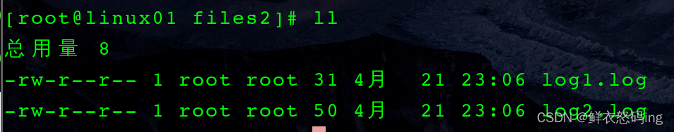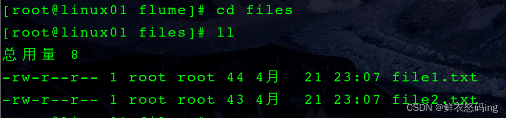 flume 文件夹中创建 files 和 files2 文件夹,分别在里面写 file1.txt 和 log1.log 用于追加内容让 flume 任务监控。