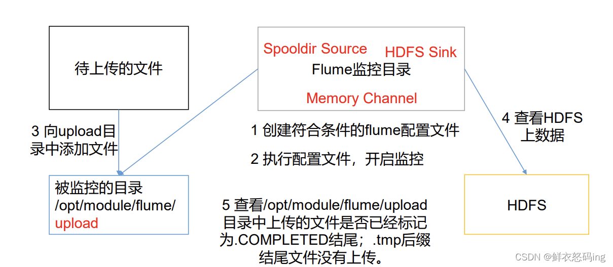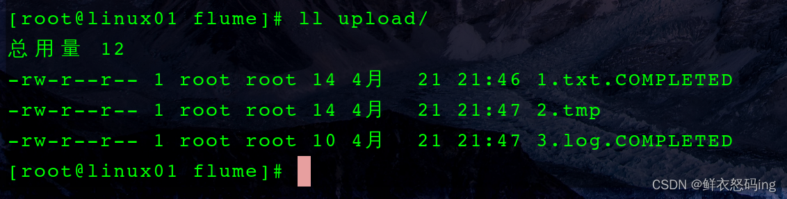 注意!向/flume/upload 文件夹放的文件不能是以上传完成的后缀结尾,比如文件上传成功后缀是 COMPLETED,那么向里面放的文件后缀就不能是 COMPLETED。另外不能向 upload 里放文件名相同的文件,文件名相同的文件只有第一个会上传到 hdfs,之后的不会,因为 linux 同一目录不允许同名文件产生。
