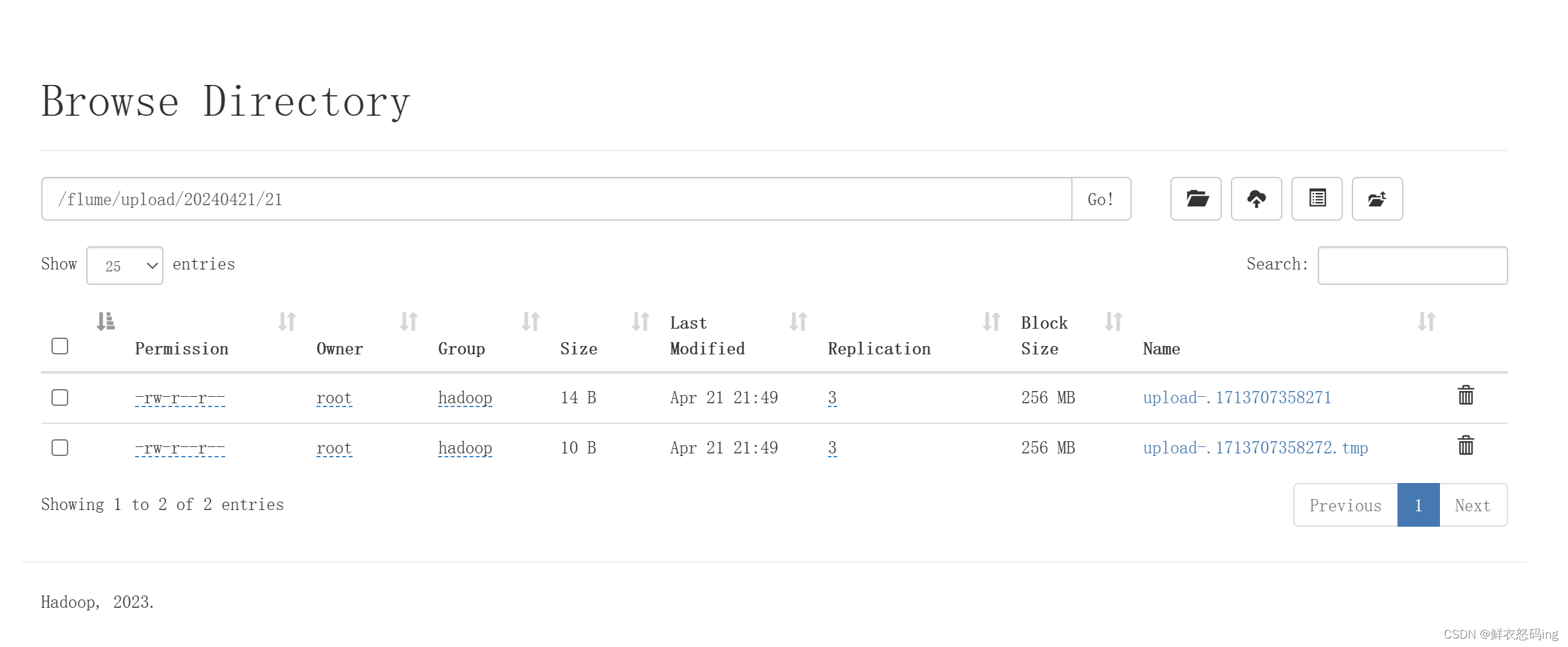 用 echo 命令向 file1.txt 和 log1.log 追加内容,追加的内容就会被 flume 检测到,filume 就会把追加的新内容上传到 hdfs 的 upload2 文件夹。