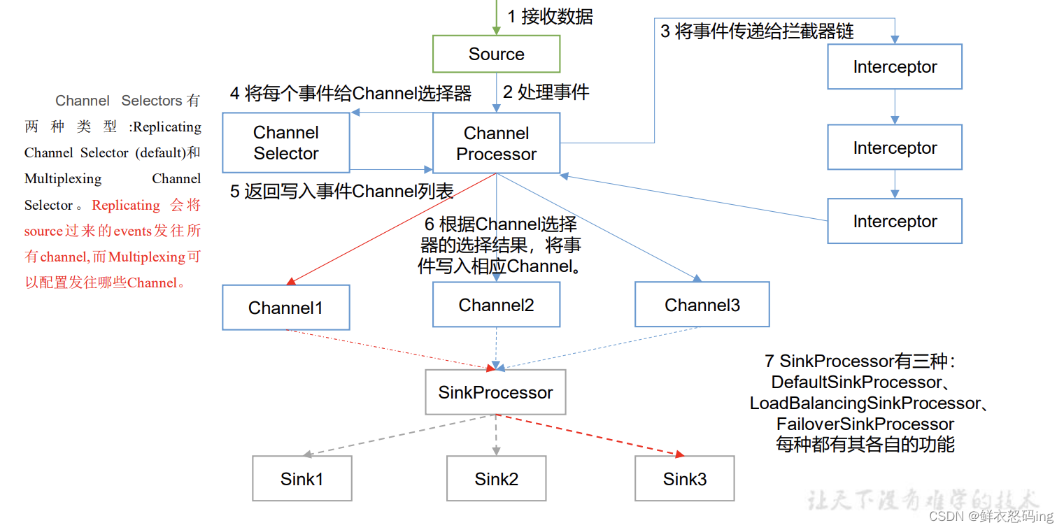 因为一个 source 可以对应对各 channel ,ChannelSelector 的作用就是选出 Event 将要被发往哪个 Channel。其共有两种类型, 分别是 Replicating(复制)和 Multiplexing(多路复用)。 ReplicatingSelector 会将同一个 Event 发往所有的 Channel,Multiplexing 会根据自定义的配置,将不同的 Event 发往不同的 Channel,Multiplexing 要结合拦截器使用,Multiplexing 会根据数据的头信息来决定发送到哪个 channel。