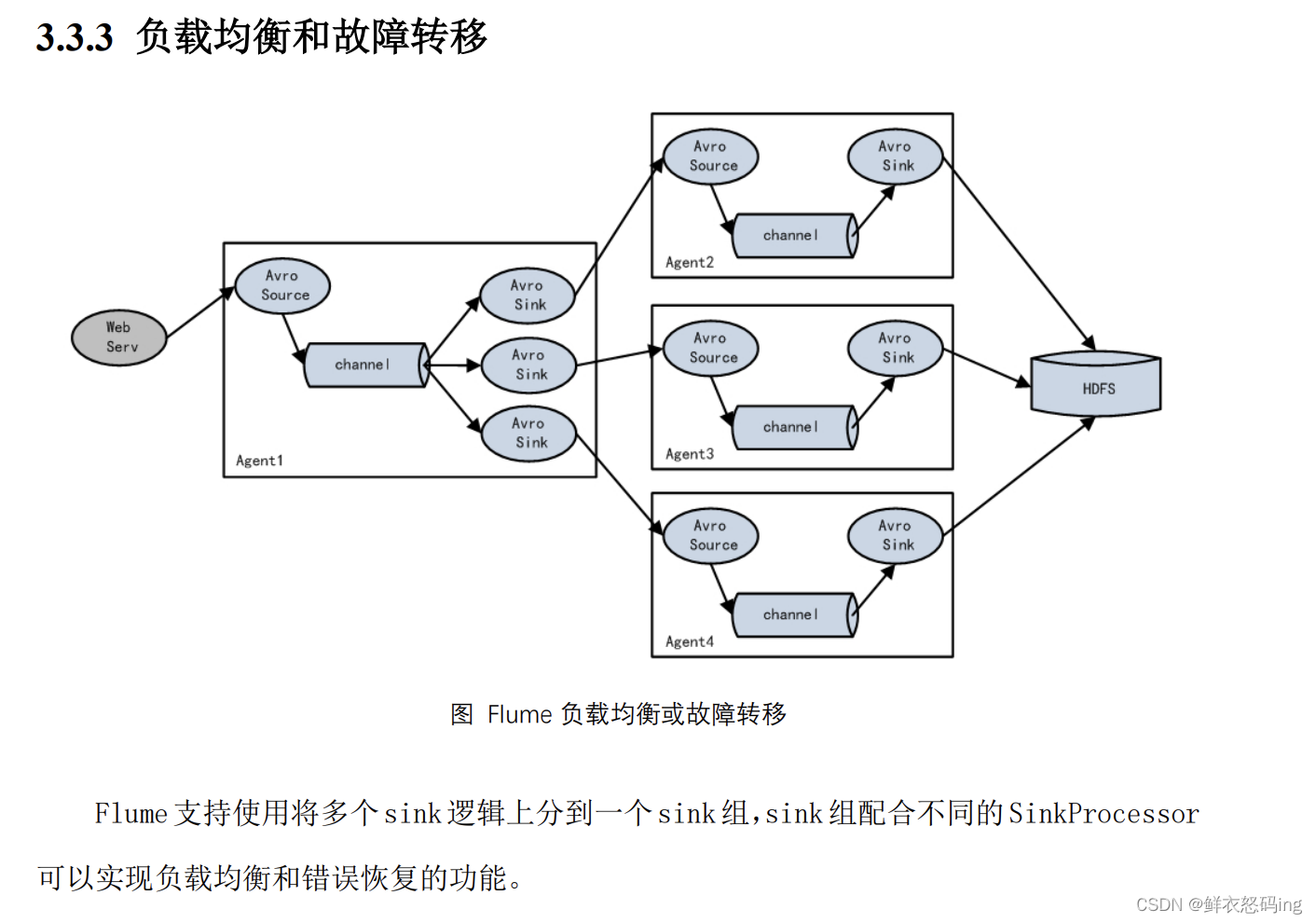 DefaultSinkProcessor 对 应 的 是 单个的 Sink , LoadBalancingSinkProcessor 和 FailoverSinkProcessor 对应的是 Sink Group,LoadBalancingSinkProcessor 可以实现负载均衡的功能,FailoverSinkProcessor 可以错误恢复的功能。