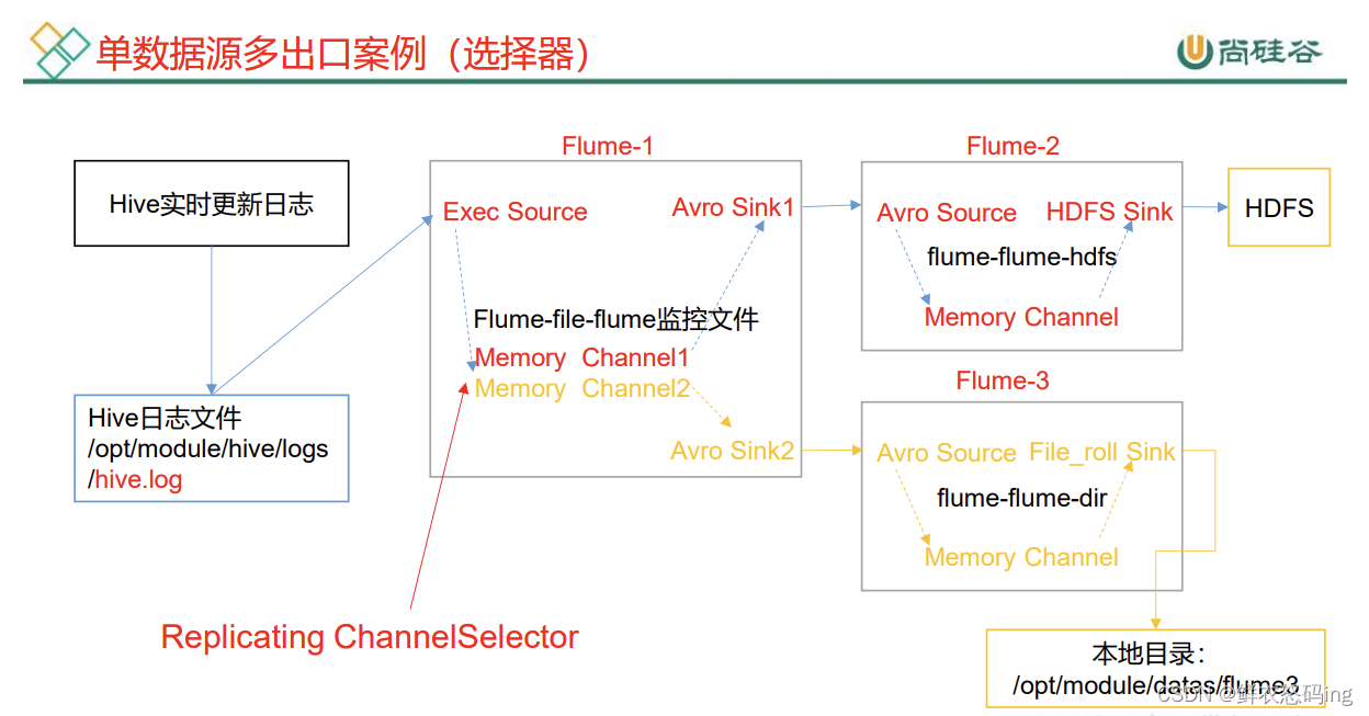 flume1 在 linux03 监听 linux01 的 hive 日志,把 hive 日志的新内容发送给 linux03 上的 flume2 和 flume3,flume2 把内容写到 hdfs,flume3 把内容写到 linux03 的本地文件/export/server/flume/job/group1/datas 文件夹中。