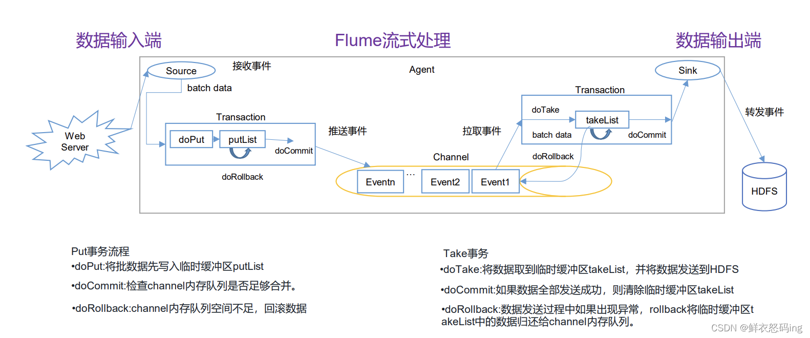 put 事务把数据批处理写入临时缓冲区 putList,,然后 doCommit 去检查 Channel 内存队列是否足够合并,如果不够,就回滚数据,如果够,就把 putList 的数据写入到 Channel,然后由 take 事务从 channel 中拉取,写入到临时缓冲区 takeList,然后把数据从 takeList 发送到 HDFS,发送完毕后清空缓冲区,如果某个数据发送失败,就回滚到 channel。