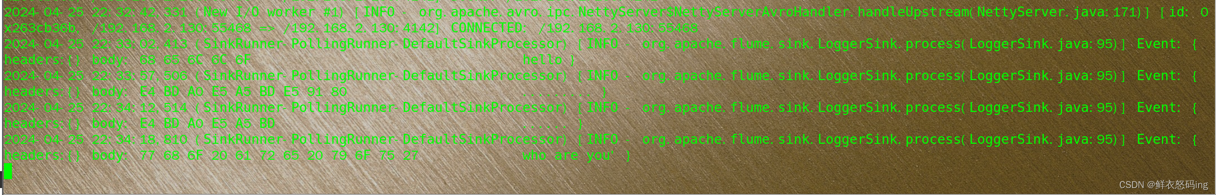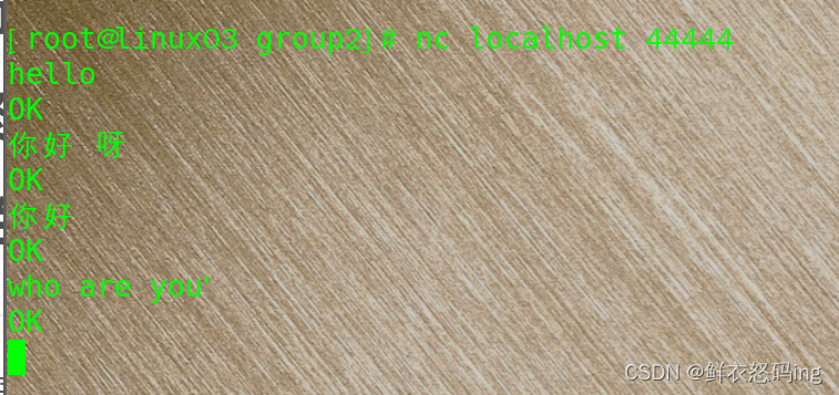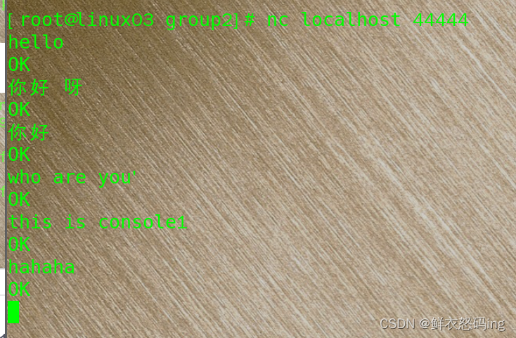以上配置完后,在 linux01 nc localhost 44444,然而