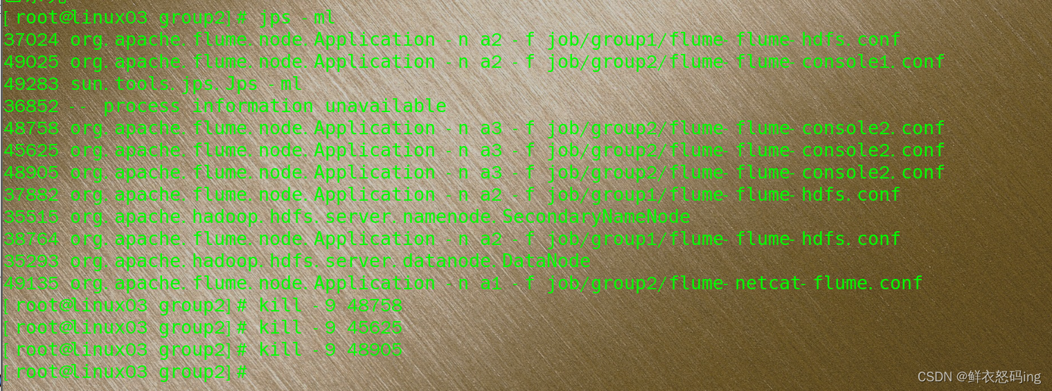flume3 成功把 hive 日志的新内容写到 datas 文件夹,说明 linux03 确实监听到了 linux01 的 hive 日志并且成功把日志从 linux01 弄到了 linux03,但是 flume2 却没有把新内容写到 hdfs,猜想的可能是因为在 linux03 上写 flume2 的配置文件**sinks.k1.hdfs.path = hdfs://linux01:9820/flume/group1/%Y%m%d/%H,**linux01 和 linux03 是不同的服务器,跨服务器没写进去,所以建议在同一台服务器搞。