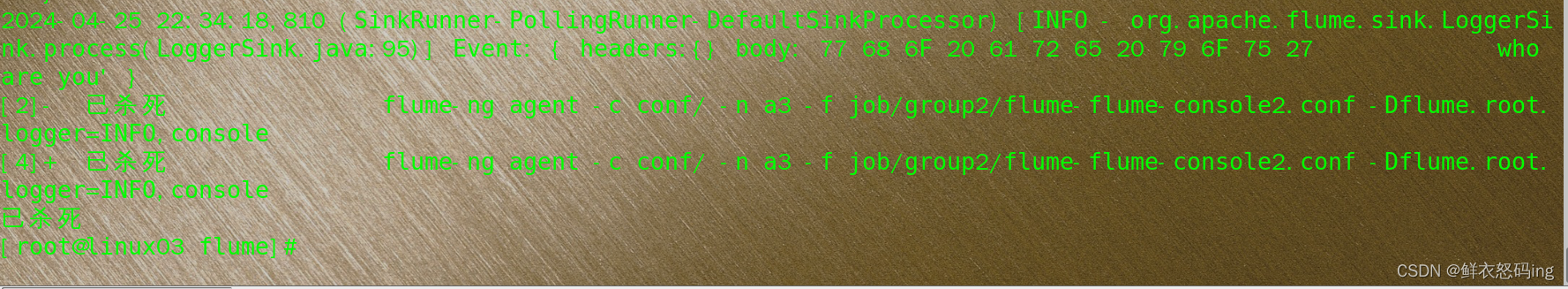 flume1 在 linux03 监听 linux01 的 hive 日志,把 hive 日志的新内容发送给 linux03 上的 flume2 和 flume3,flume2 把内容写到 hdfs,flume3 把内容写到 linux03 的本地文件/export/server/flume/job/group1/datas 文件夹中。