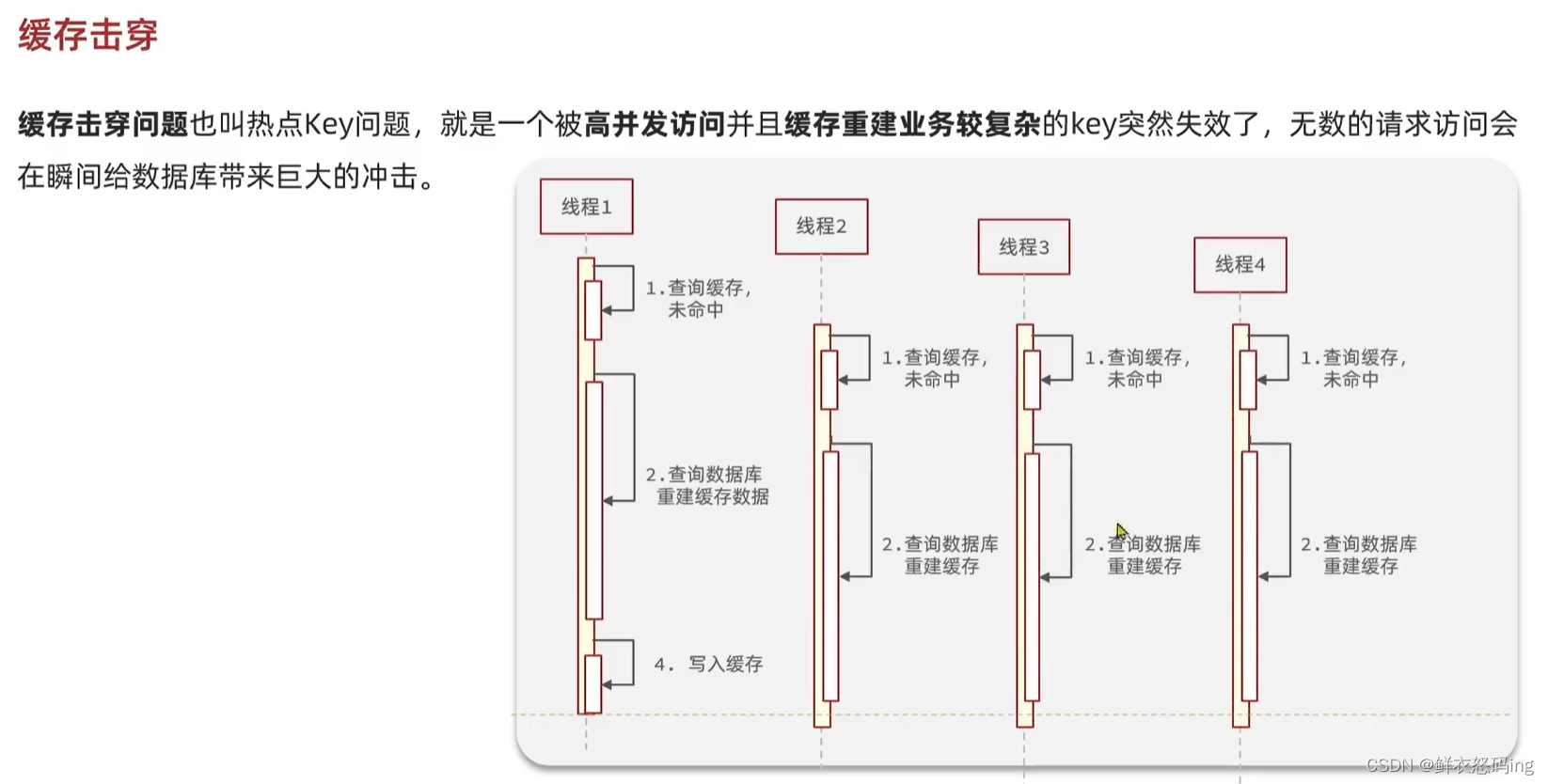 - 一个被高并发访问并且缓存重建业务复杂的 key 突然失效,大量请求瞬间打到数据库