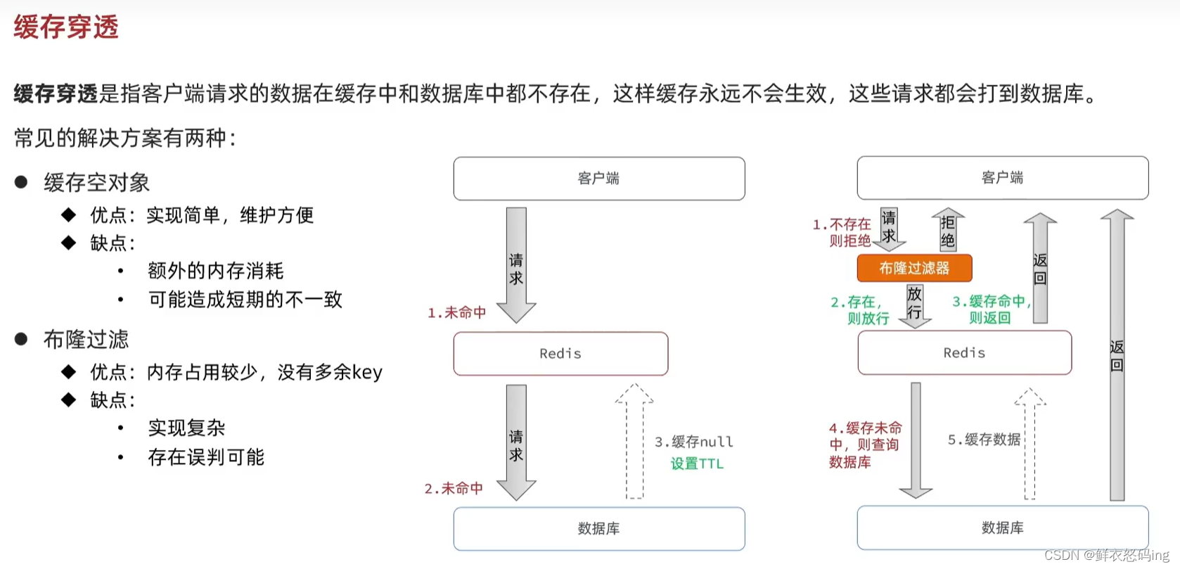 - 客户端请求的数据在缓存和数据库中都不存在,这样缓存永远不会生效,那么所有请求都会直接打到数据库上,增大数据库压力