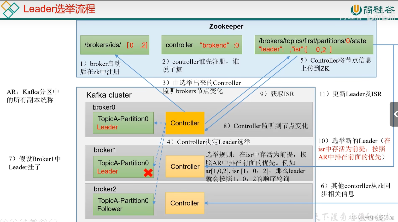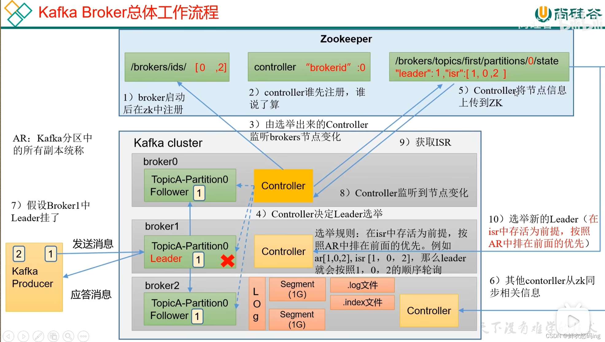 每一个集群都会选举出一个 Broker 作为集群控制器 **(Controller),它负责分区 Leader 选举,还负责管理主题分区及其副本的状态、元数据管理。**如果在运行过程中,Controller 节点出现了故障,那么 Kafka 会依托于 ZooKeeper 软件选举其他的节点作为新的 Controller,让 Kafka 集群实现高可用。