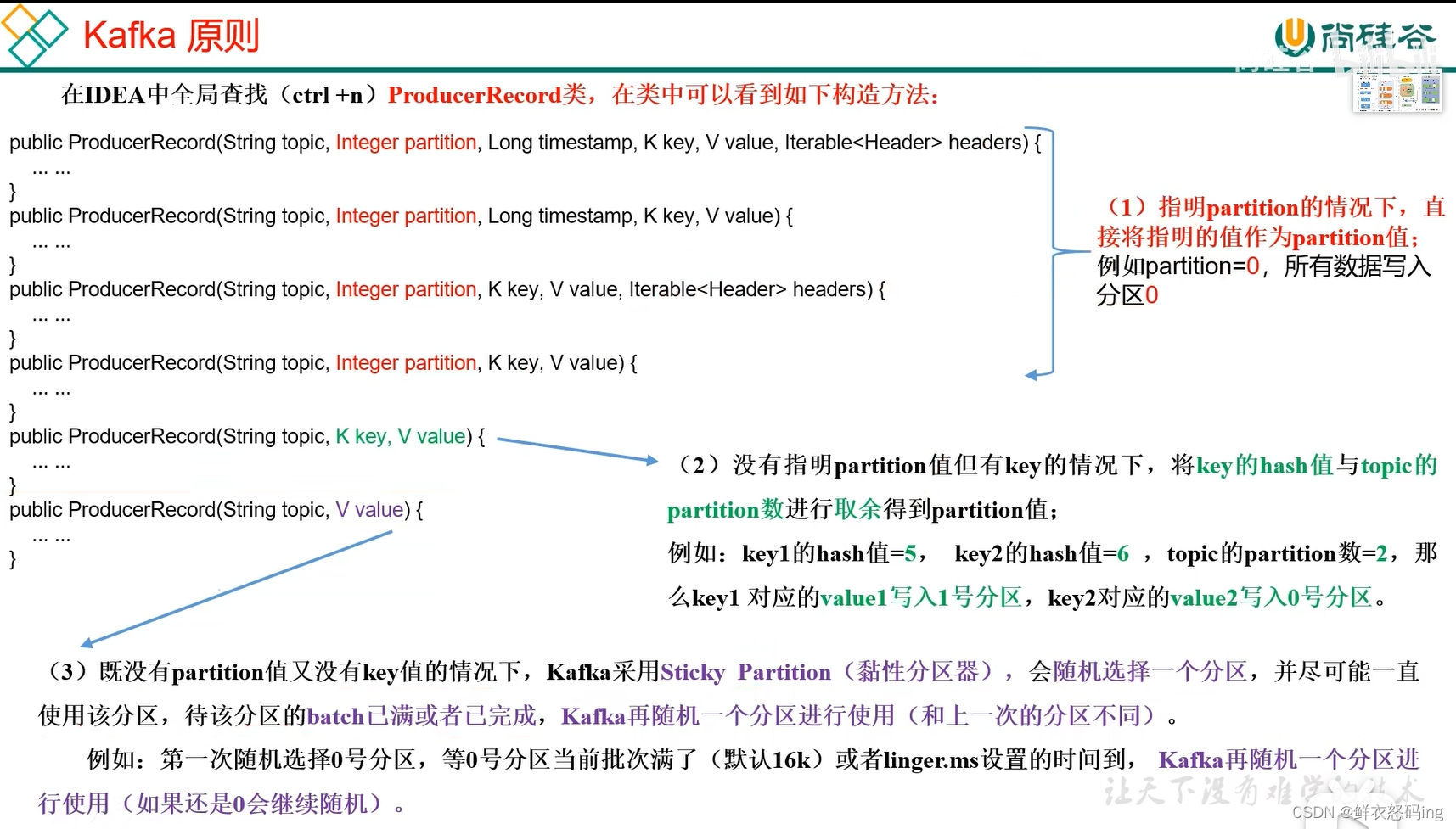 - 接下来,数据被传给分区器。如果之前已经在 ProducerRecord 对象里指定了分区,那么分区器 就不会再做任何事情。如果没有指定分区 ,那么分区器会根据 ProducerRecord 对象的键来选择一个分区。