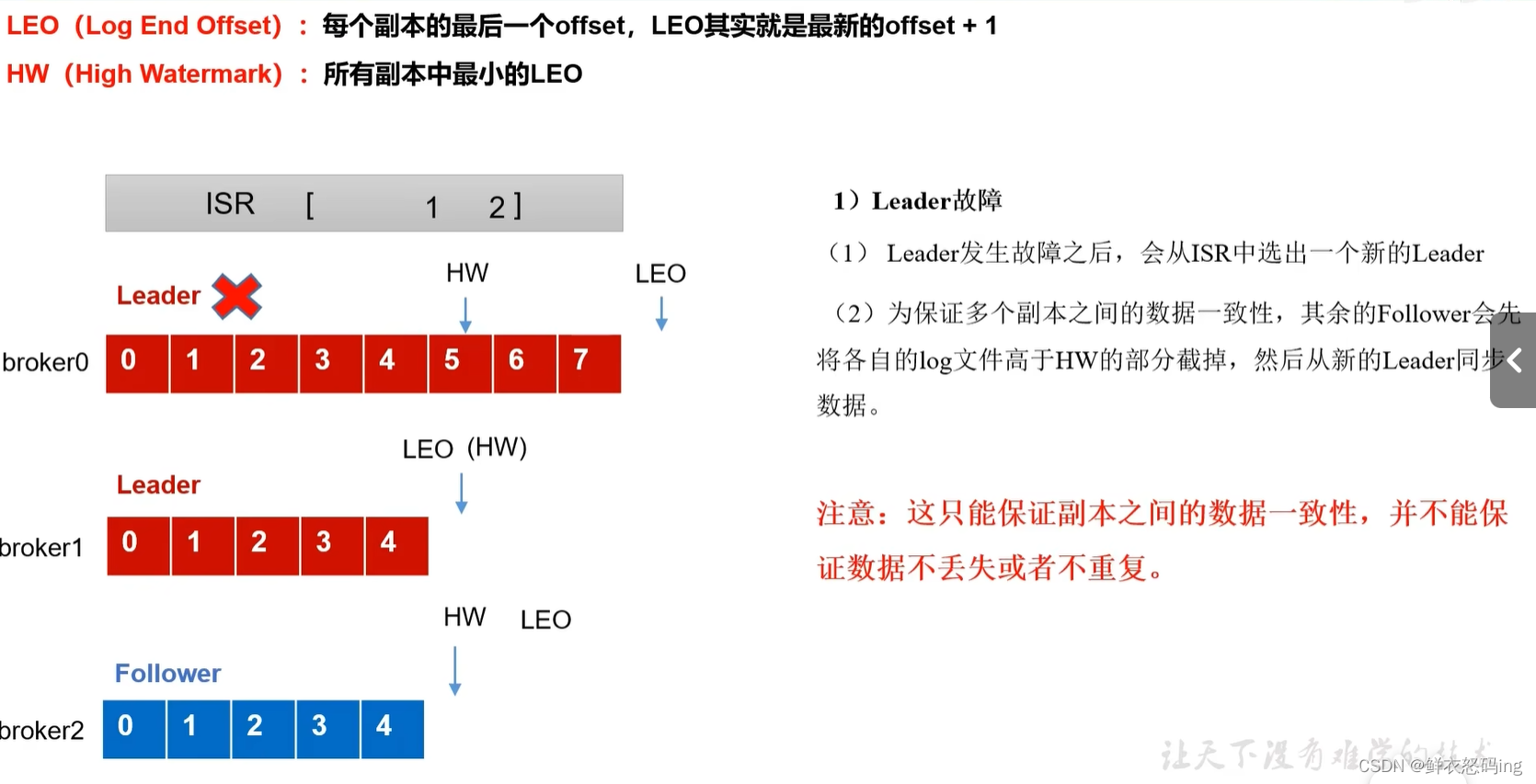 - 需要注意的是,并不是所有保存在分区首领上的数据都可以被客户端读取到,为了保证数据一致性,只有被所有同步副本 (ISR 中所有副本) 都保存了的数据才能被客户端读取到。