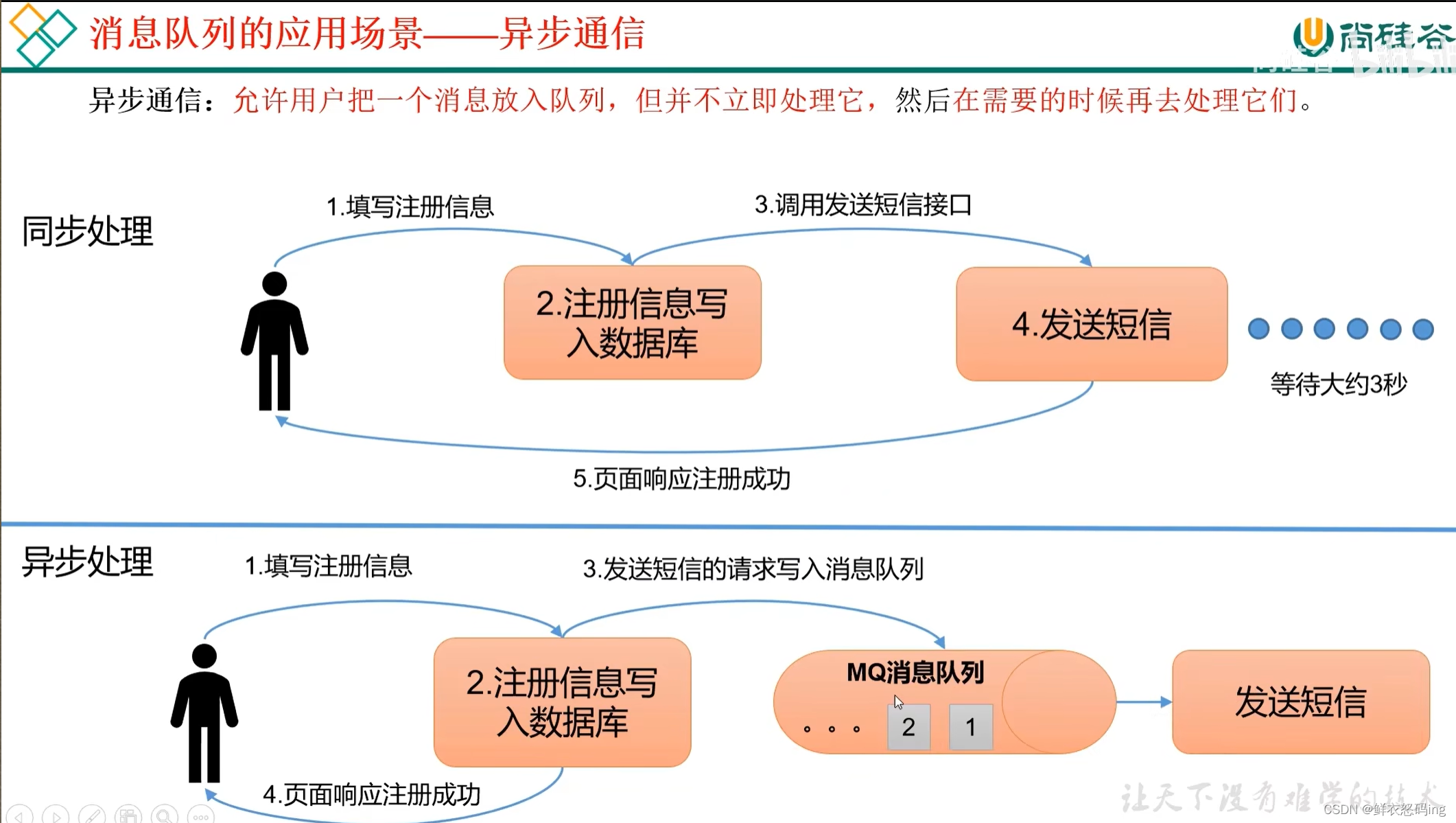 - 该方法有如下优点:1.避免了直接调用下一个系统导致当前系统失败; 2.每个子系统对于消息的处理方式可以更为灵活,可以选择收到消息时就处理,可以选择定时处理,也可以划分时间段按不同处理速度处理;