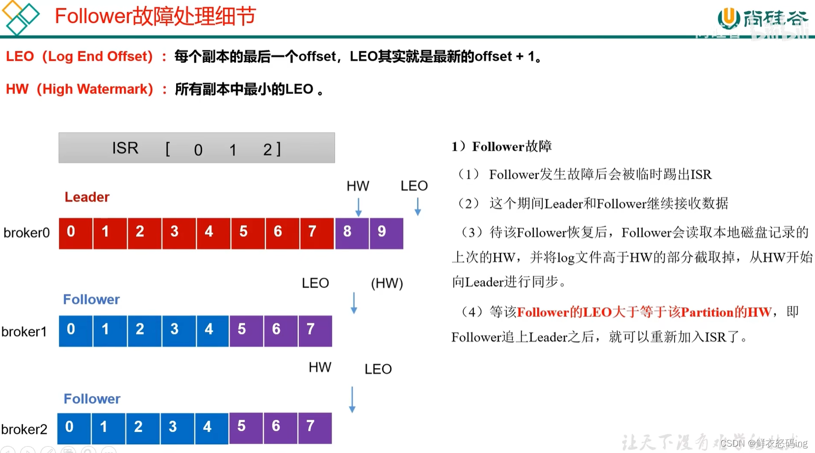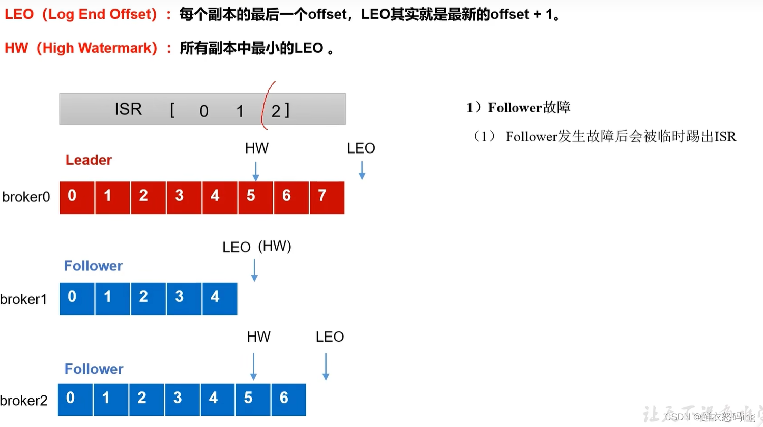 日志末端位移(Log End Offset),表示下一条待写入消息的 offset,每个分区副本都会记录自己的 LEO。对于 Follower 副本而言,它能读取到 Leader 副本 LEO 值以下的所有消息。