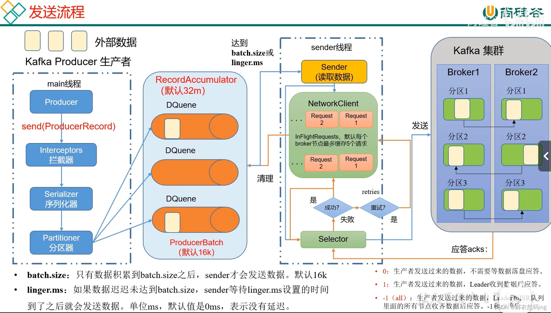 - 服务器在收到这些消息时会返回一个响应。如果消息成功写入 Kafka,就返回一个 RecordMetaData 对象,它包含了主题和分区信息,以及记录在分区里的偏移量。如果写入失败,则会返回一个错误。sender 线程会重新执行写入请求,如果达到指定的重试次数后还没有成功,则直接抛出异常,不再重试。写入成功后,请求会从 sender 线程中删除。(后面消息可靠性会详解) >