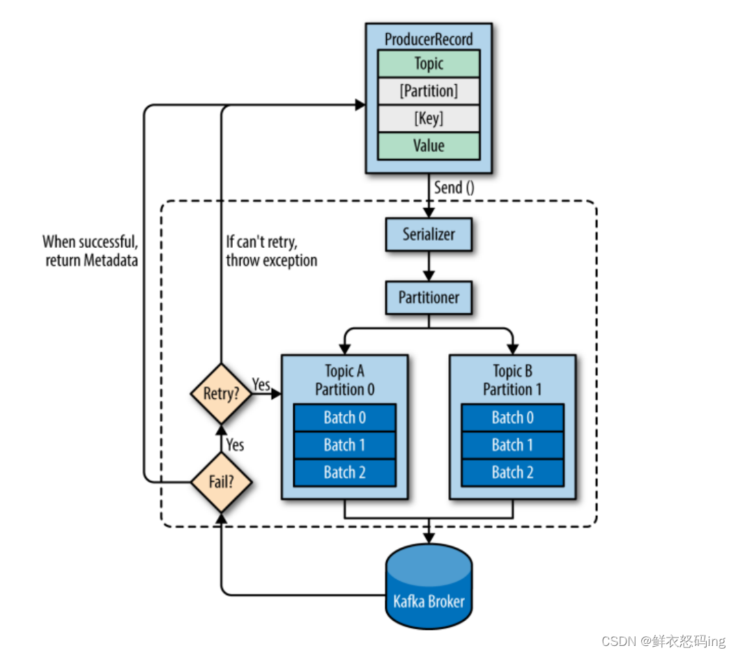 - Kafka 的main 线程会将发送消息包装为 ProducerRecord 对象, ProducerRecord 对象包含了目标主题和要发 送的内容,同时还可以指定键和分区。在发送 ProducerRecord 对象前,生产者会先把键和值对象序列化成字节数组,这样它们才能够在网络上传输。