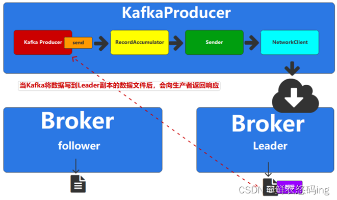 当生产数据时,Leader 副本将数据接收到并写入到了日志文件后,就会对当前的数据请求进行响应(确认应答),如果是同步发送数据,此时就可以发送下一条数据了。如果是异步发送数据,回调方法就会被触发。这种方式消息可靠性较高,但是此时只有 Leader 节点存储了数据,还没有备份到 follower 副本,那么一旦当前存储数据的 broker 节点出现了故障,数据也依然会丢失。