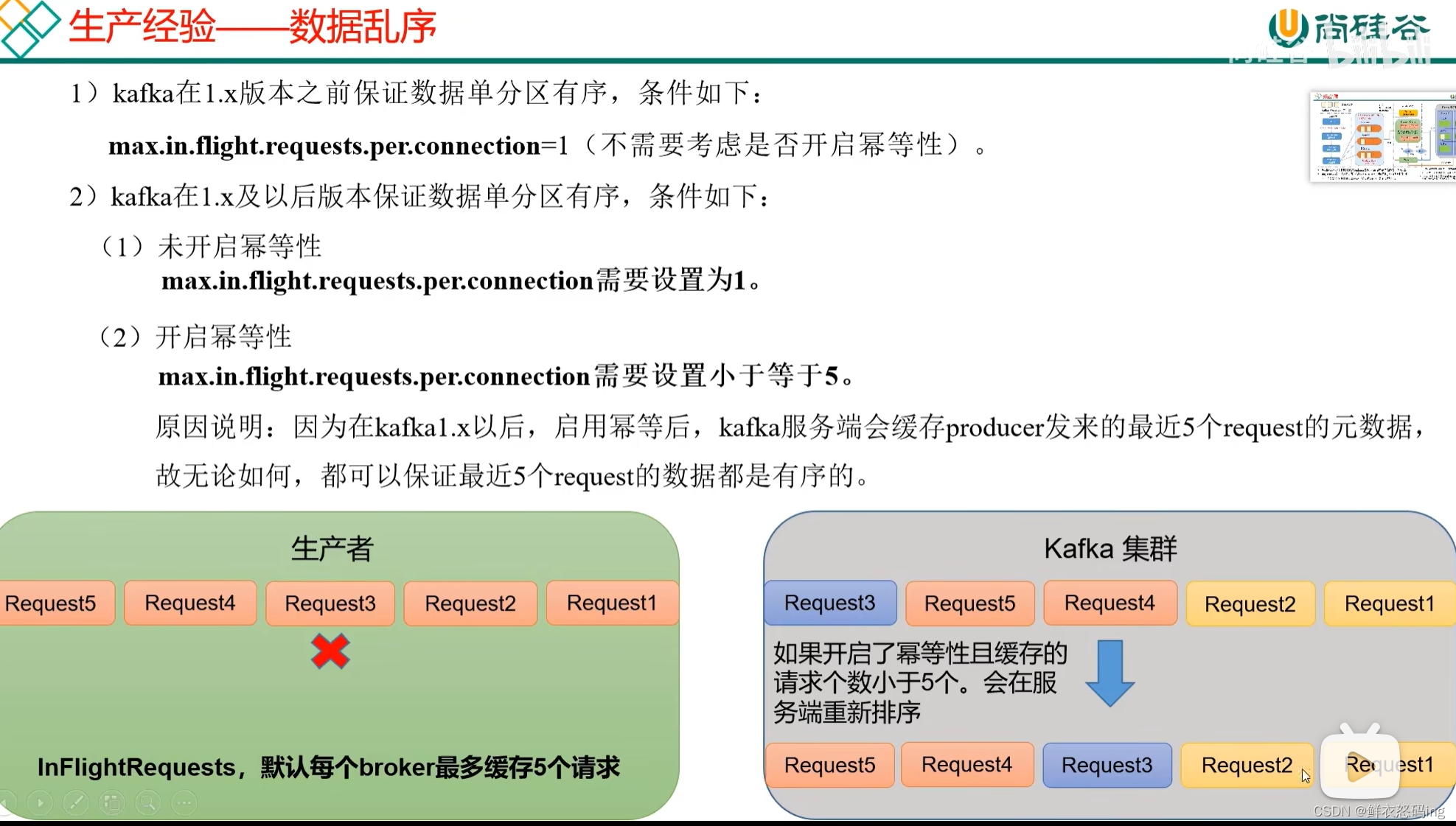 如上图,在 1.x 版本之前,为了保证数据有序性,每个 broker 只能缓存一个请求,在 1.x 之后,开启幂等性,可以缓存多个请求,请求会在 kafka 服务端重新排序。