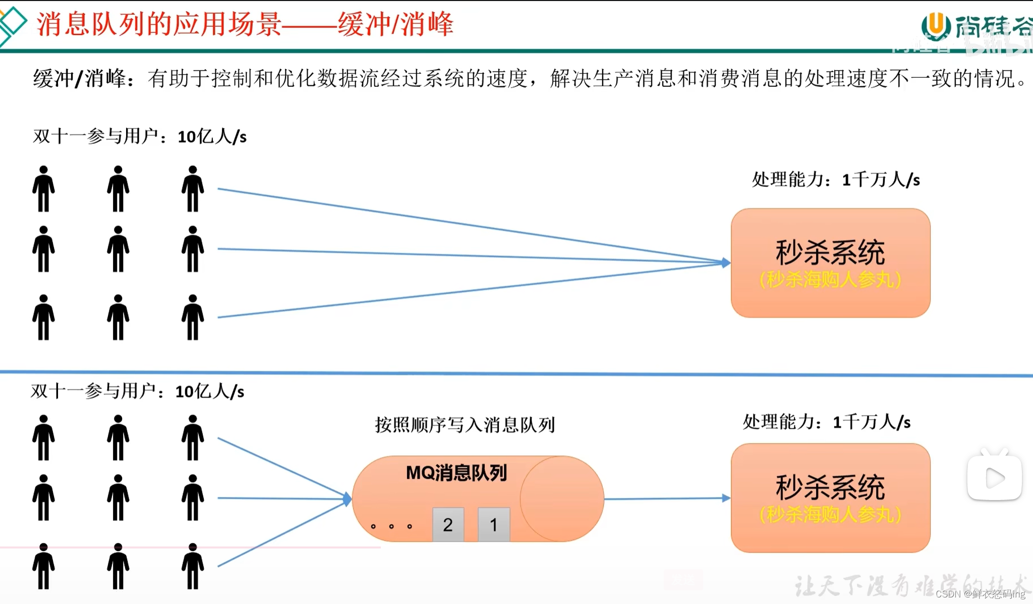- 限流削峰: 广泛应用于秒杀或抢购活动中,避免流量过大导致应用系统挂掉的情况。该方法有如下优点: