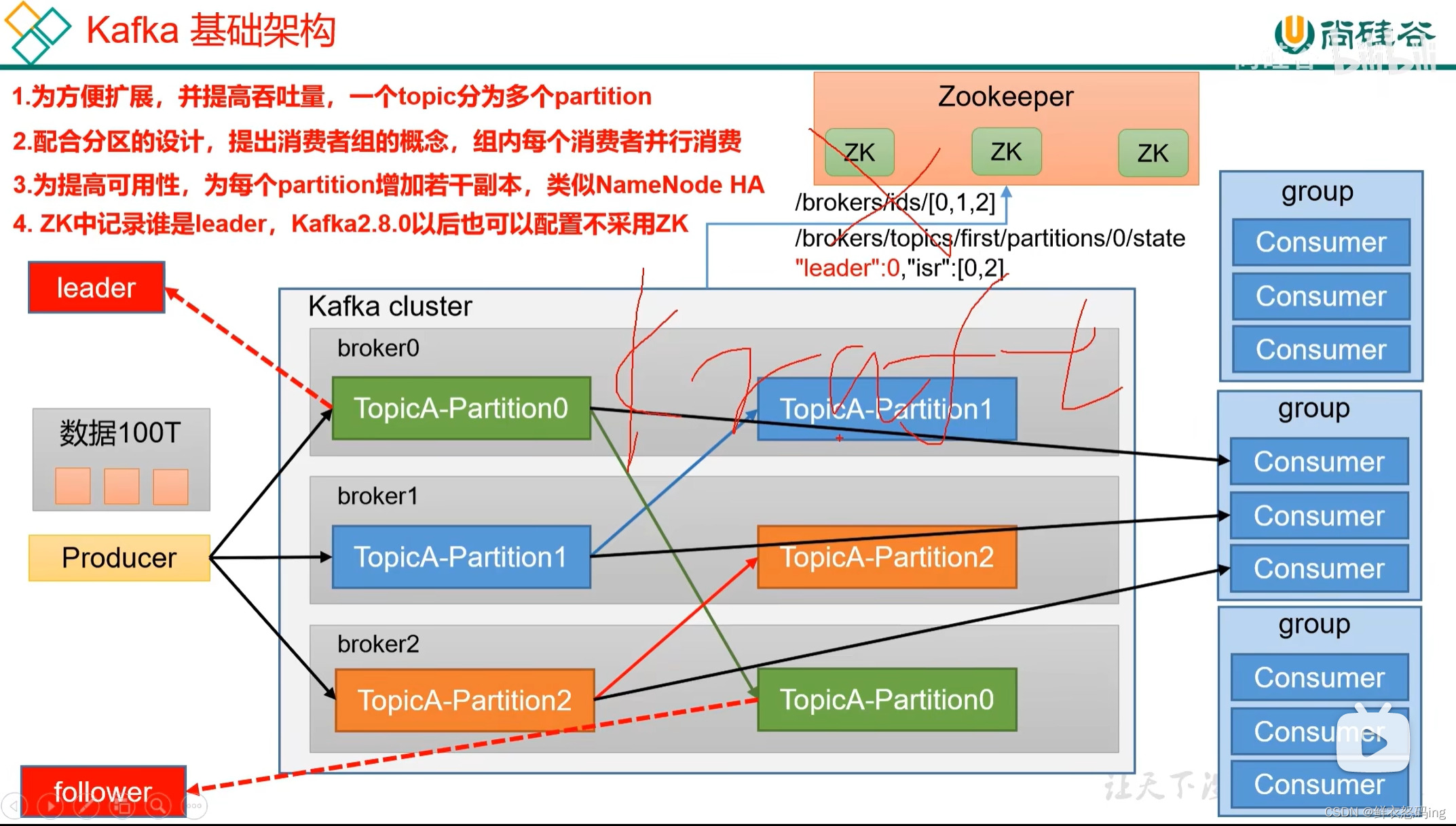 - 副本因子的作用:让 kafka 读取数据和写入数据时的可靠性。 副本因子是包含本身,相同的副本因子不能放在同一个 broker。