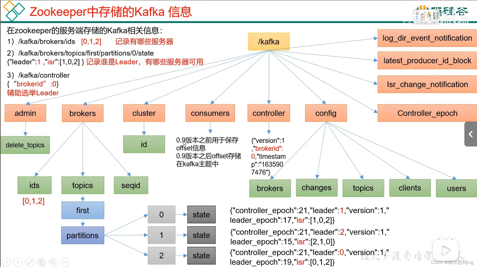 - /kafka/brokers/ids 节点,用于 Broker 上下线的监听,记录有哪些 kafka 服务器在线。