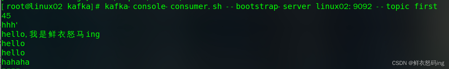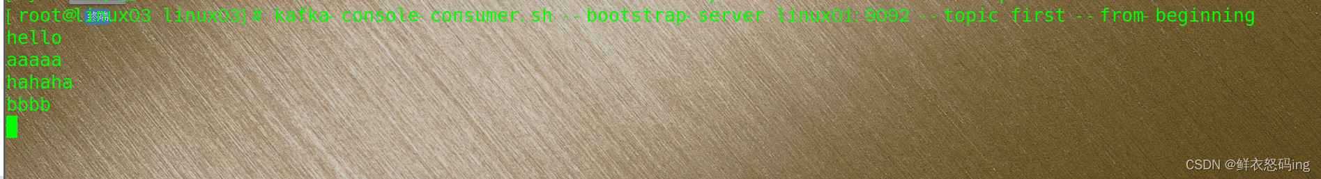 先启动生产者,生产 hello、hahaha,再启动消费者,生产者再生产 aaaaa、bbbb。此时 hello、hahaha 属于历史消息,不会显示,只显示 aaaaa、bbbb,若想显示历史消息,需要如下,此时消息是乱序的: