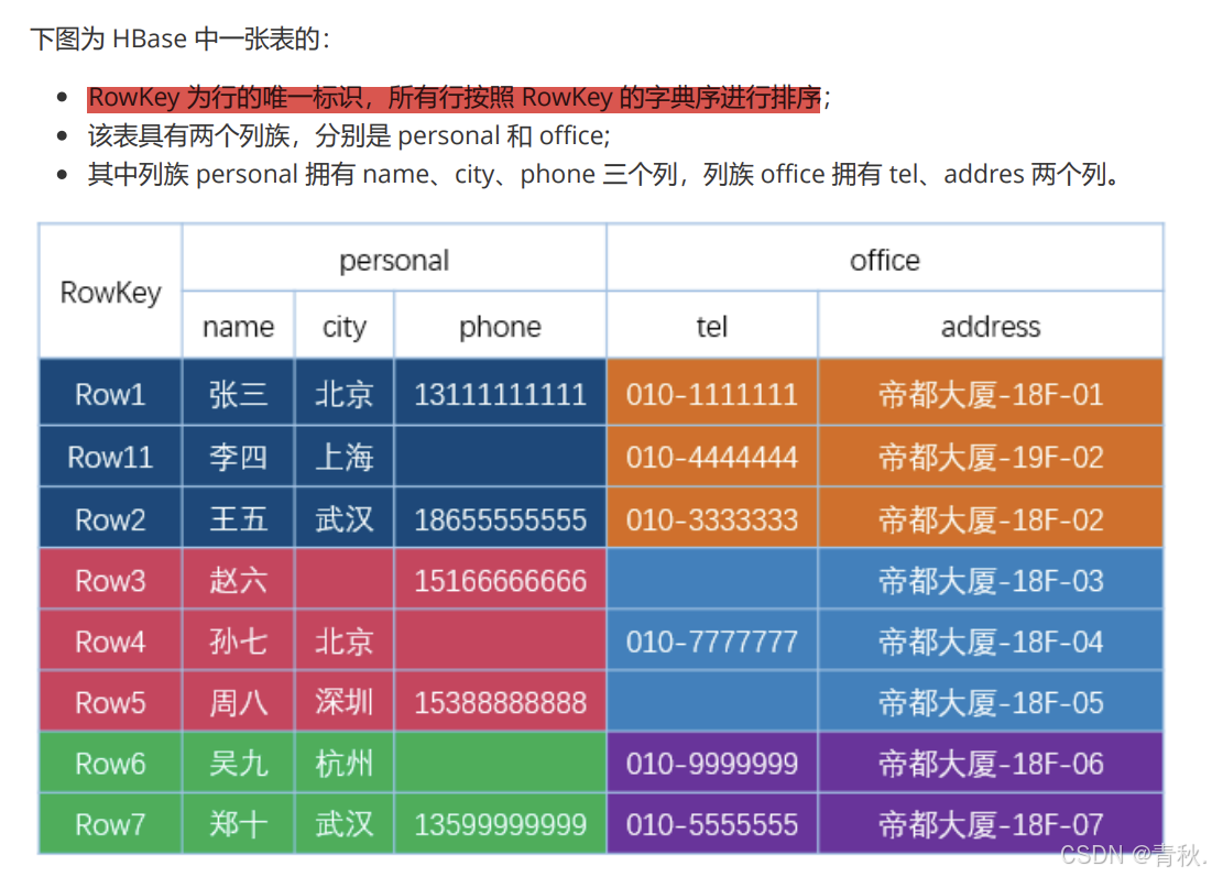 - 列族的所有列都以列族名作为前缀,例如 courses:history , courses:math 都属于 courses 这个列族。