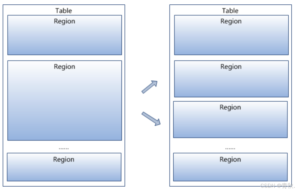 每个表一开始只有一个 Region ,随着数据不断增加, Region 会不断增大,当增大到一个阀值的时 候, Region 就会等分为两个新的 Region 。当 Table 中的行不断增多,就会有越来越多的 Region 。