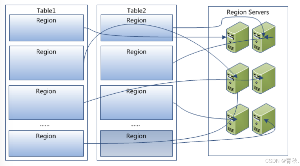 HBase Table 中的所有行按照 Row Key 的字典序排列。HBase Tables 通过行键的范围 (row key range) 被水平切分成多个 Region , 一个 Region 包含了在 start key 和 end key 之间的所有行。