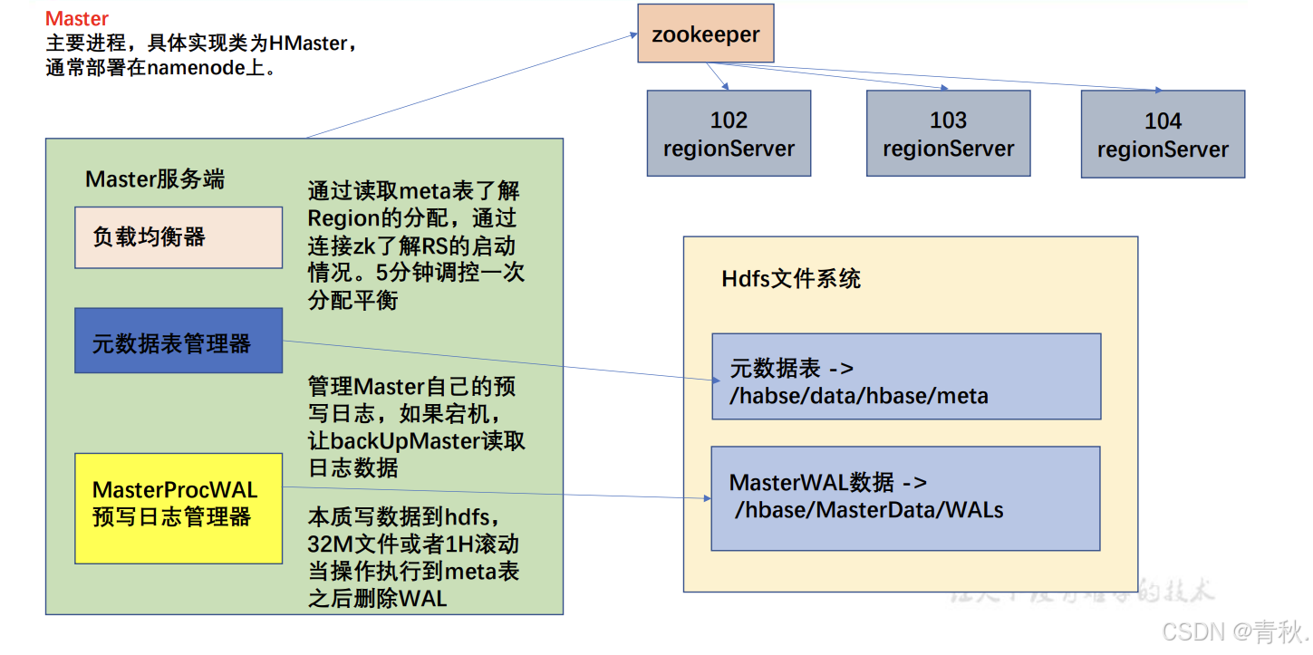 - 所有 Masters 会竞争性地在 Zookeeper 上创建同一个临时节点,由于 Zookeeper 只能有一个同名节点,所以必然只有一个 Master 能够创建成功,此时该 Master 就是主 Master,主 Master 会 定期向 Zookeeper 发送心跳。备用 Masters 则通过 Watcher 机制对主 HMaster 所在节点进行监听;