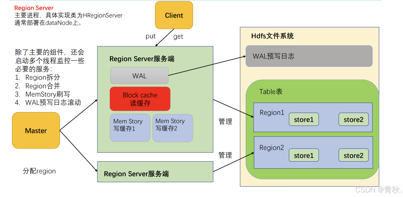 Region Server 运行在 HDFS 的 DataNode 上。它具有以下组件: