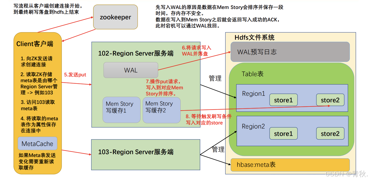 - WAL(Write Ahead Log,预写日志):对 HBase 读写数据的时候,数据不是直接写进磁盘,它会在内存中保留一段时间,但把数据保存在内存中可能有更高的概率引起数据丢失,为了解决这个问题,数据会先写在一个叫 做 Write-Ahead logfile 的文件中存储尚未进持久化存储的数据记录,以便在发生故障时进行恢复。