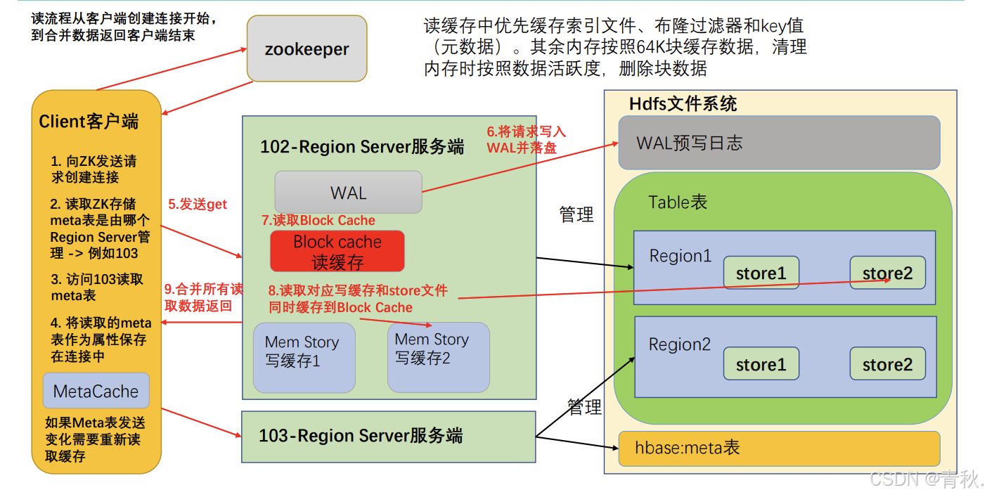- 如果再次读取,客户端将从缓存中获取行键所在的 Region Server。这样客户端就不需要再次查询 META 表,除非 Region 移动导致缓存失效,这样的话,则将会重新查询并更新缓存。