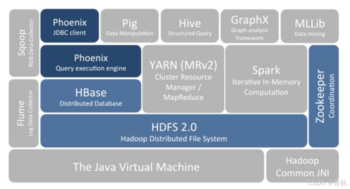 - Phoenix 的理念是 we put sql SQL back in NOSQL ,即可以使用标准的 SQL 就能完成对 HBase 上数据的操作,这也意味着可以通过集成 Spring Data JPA 或 Mybatis 等常用的持久层框架来操作 HBase。