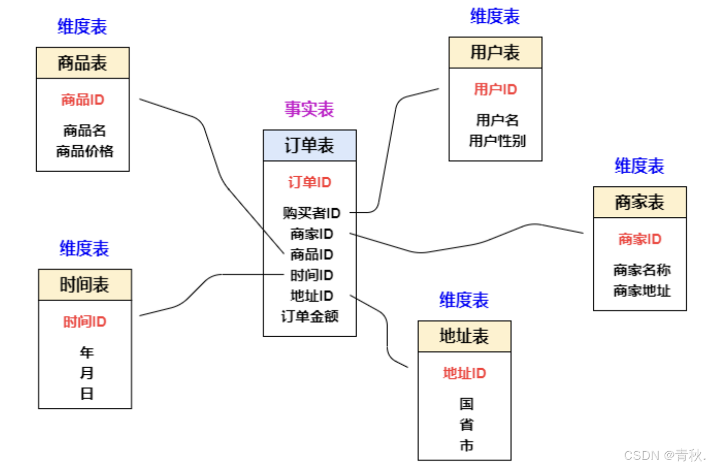 - 维度表:维度表可以看成是用户用来分析一个事实的窗口,它里面的数据应该是对事实的各个方面描述,比如时间维度表,地域维度表,维度表是事实表的一个分析角度。