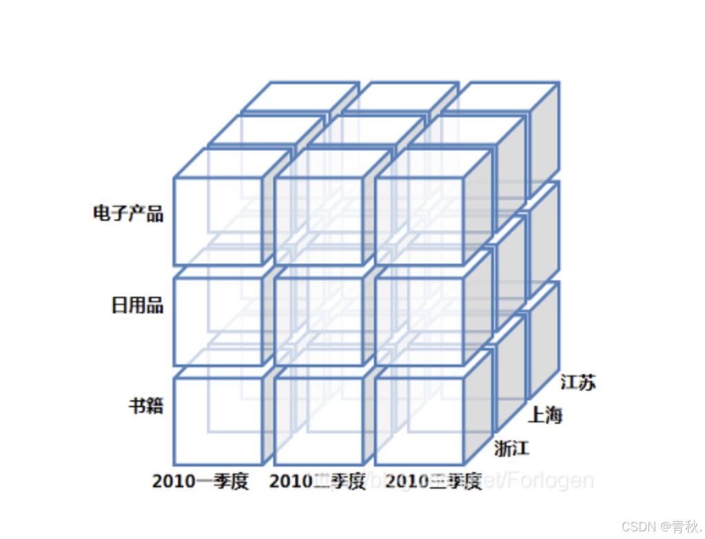 - 维度:一般是一个离散的值,比如时间维度上每一个独立的日期或地域,因此统计时,可以把维 度相同记录的聚合在一起,应用聚合函数做累加、均值、最大值、最小值等聚合计算。
