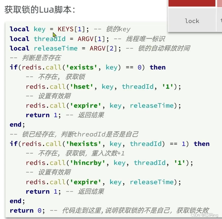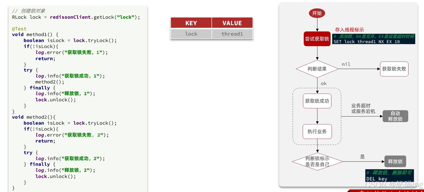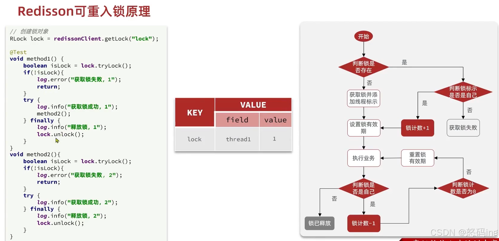 在同一线程中,method1 成功获取锁后调用 method2,method2 也尝试获取锁,此时要先判断 method2 所在线程和 method1 所在线程是否是同一线程,若是,则 method2 也获取锁成功,它和 method1 显然获取了同一个锁**,那么该锁被获取次数+1,而这个锁被获取的次数我们需要记录,也就是说 value 不仅要记录 线程名 还要记录 锁被获取的次数,那么我们就由此采用 hash 类型更合理!**