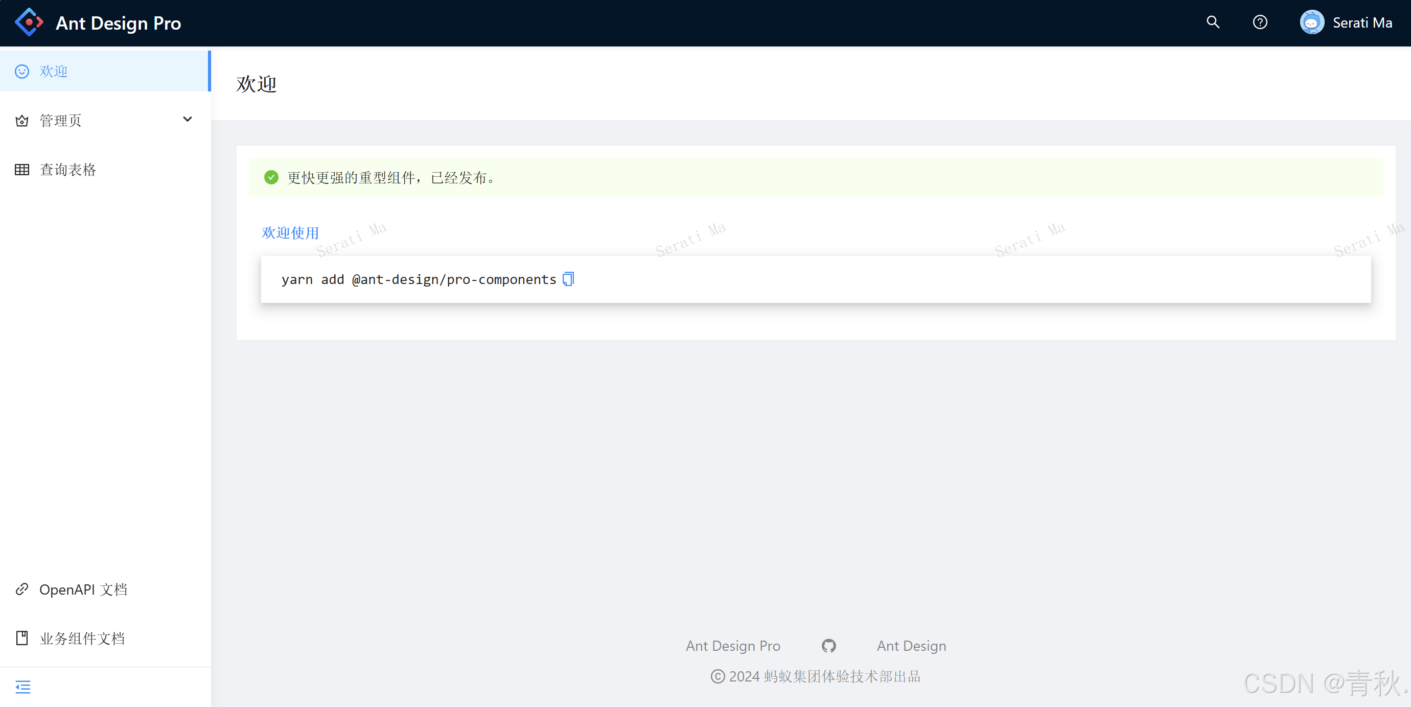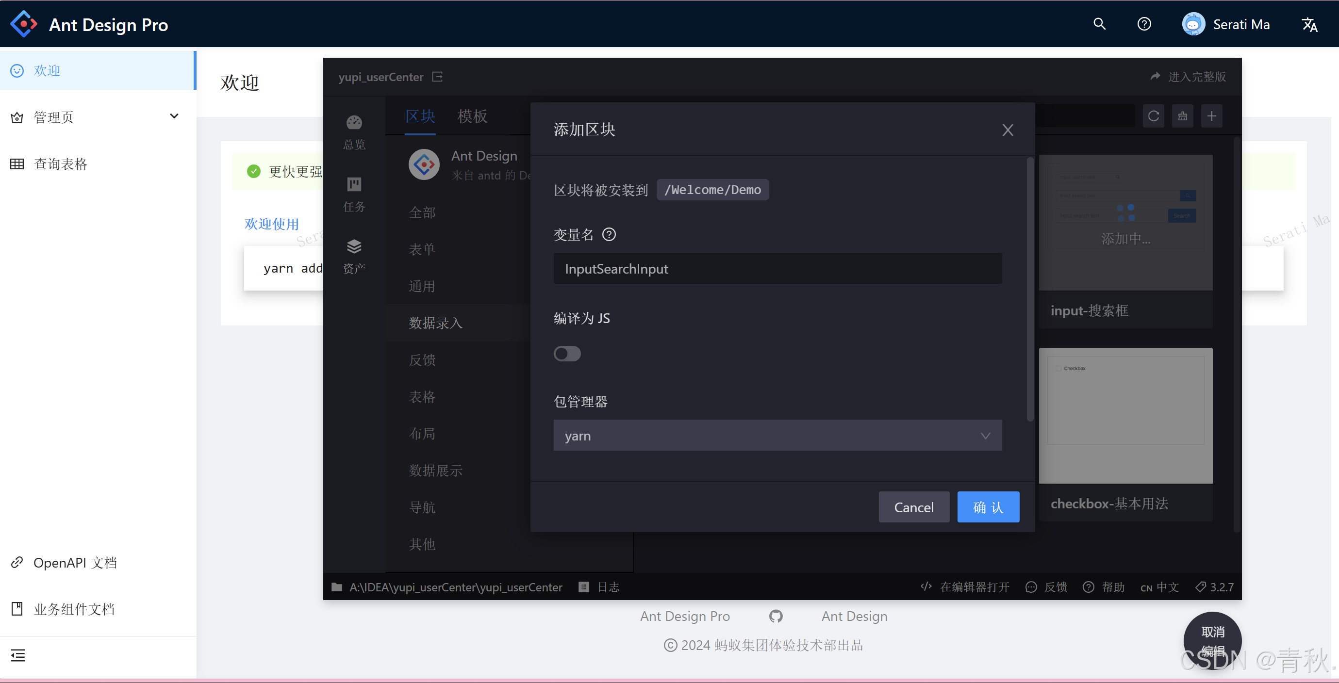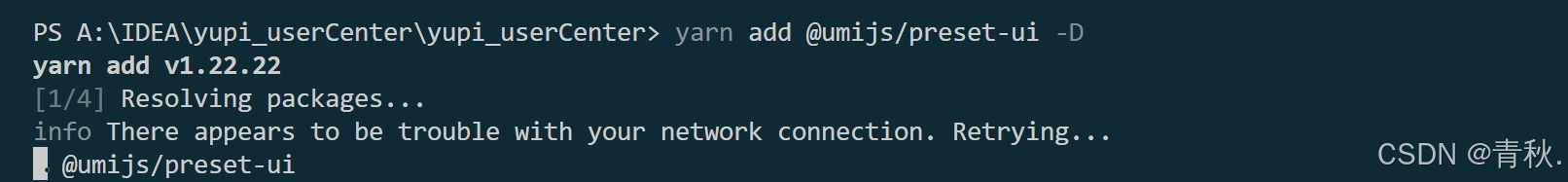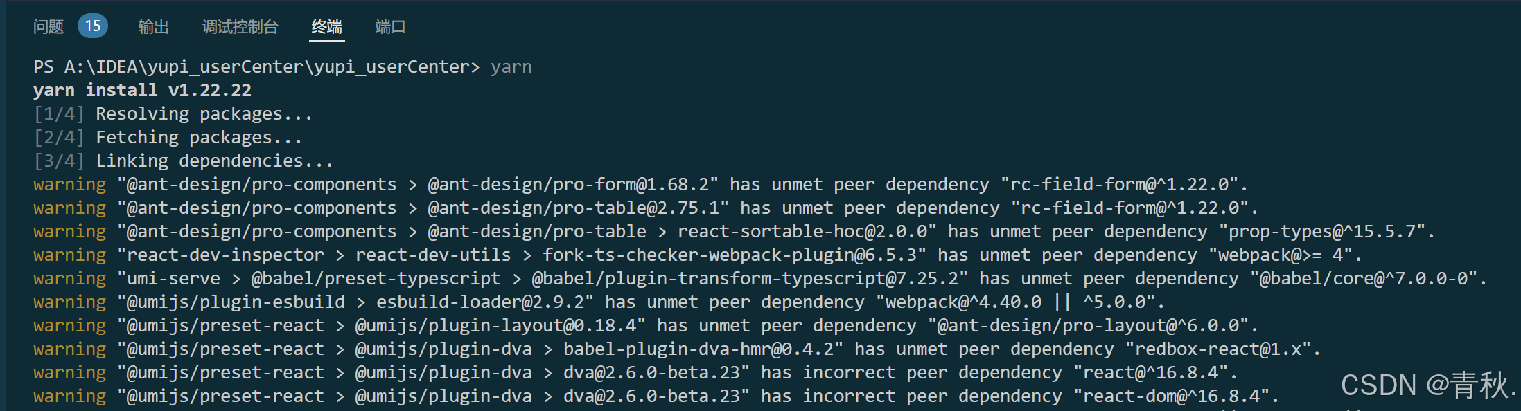 启动 start 脚本,第一次启动可能出错,原因是项目的某些依赖还没有引入,此时只需在控制台运行 yarn 命令,它就会自动下载需要引入的依赖,如图: