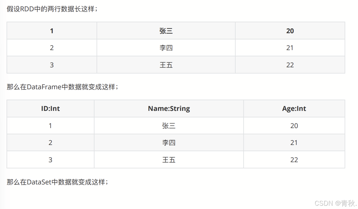 - DataFrame 和 Dataset 可以理解为是⼀张 mysql 中的⼆维表,表有什么?表头,表名,字段,字段类型。RDD 其实说白了也是⼀张二维表,但是这张二维表相比较于 DataFrame 和 Dataset 却少了很多东西,比如表头,表名,字段,字段类型,只有数据和操作数据的方法。