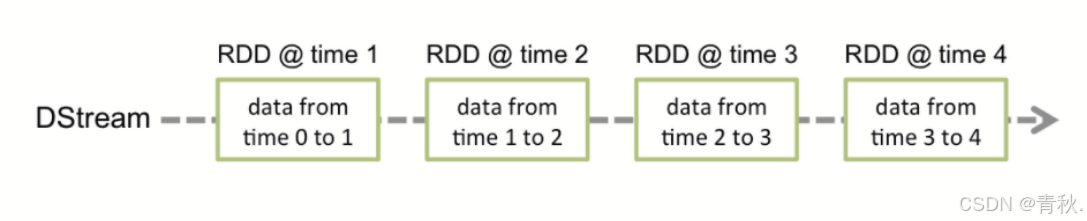 - **DStream 的内部,其实是一系列时间上连续的 RDD。DStream 中的每个 RDD 都包含了⼀个时间段内的数据。