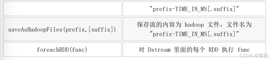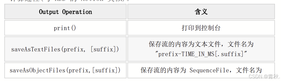 Output Operations 可以将 DStream 的数据输出到外部的数据库或文件系统。 当某个 Output Operations 被调用时,spark streaming 程序才会开始真正的 计算过程(与 RDD 的 Action 类似)。