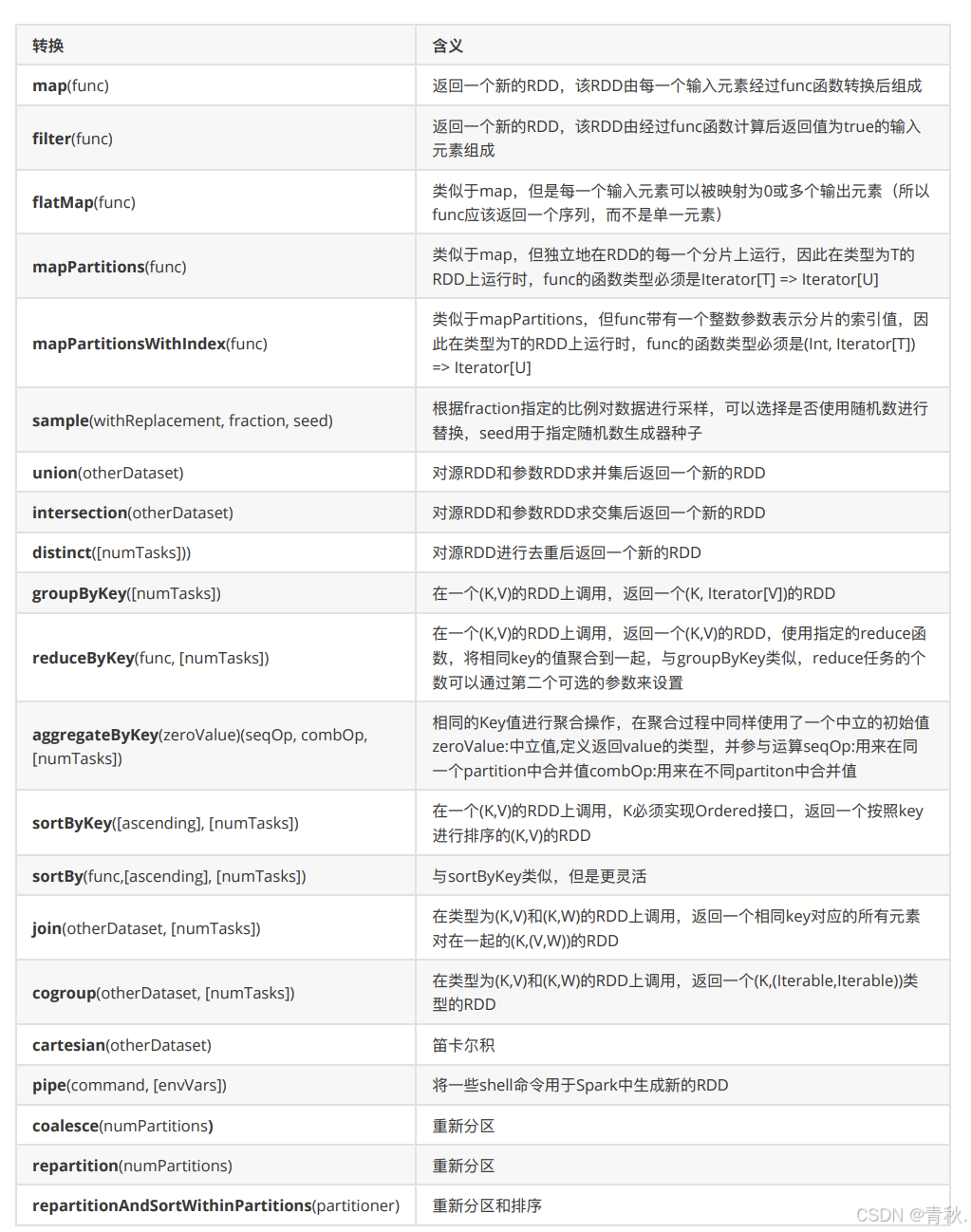 RDD 中的所有转换都是延迟加载的,它们只是记住这些应⽤到基础数据集上的转换动作,并不会直接计算结果。只有当发生⼀个要求返回结果给 Driver 的动作时,这些转换才会真正运 行。这样可以在 Action 时对 RDD 操作形成 DAG 有向无环图进行 Stage 的划分和并行优化,这这种设计让 Spark 更加有效率地运行! 列举部分算子: