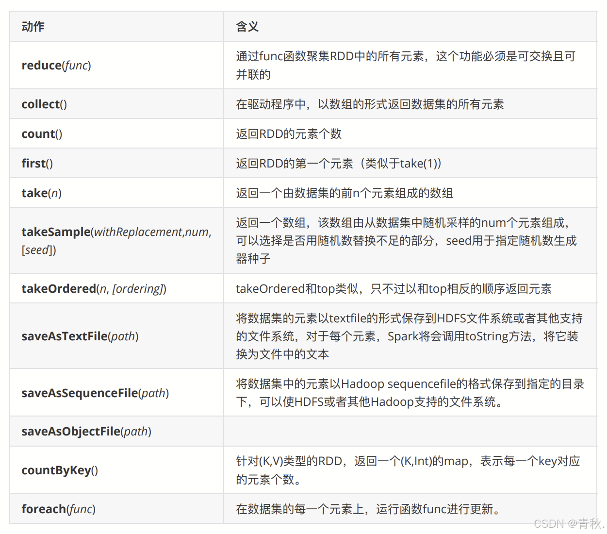 在 RDD 上运⾏计算,并返回结果给 Driver 或写入文件系统, 列举部分算子: