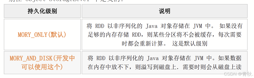 - RDD 通过 persist 或 cache 方法可以将前面的计算结果缓存,但是并不是这两个方法被调用时立即缓存,而是触发后面的 action 时,该 RDD 将会被缓存在 计算节点的内存中,并供后面重用。