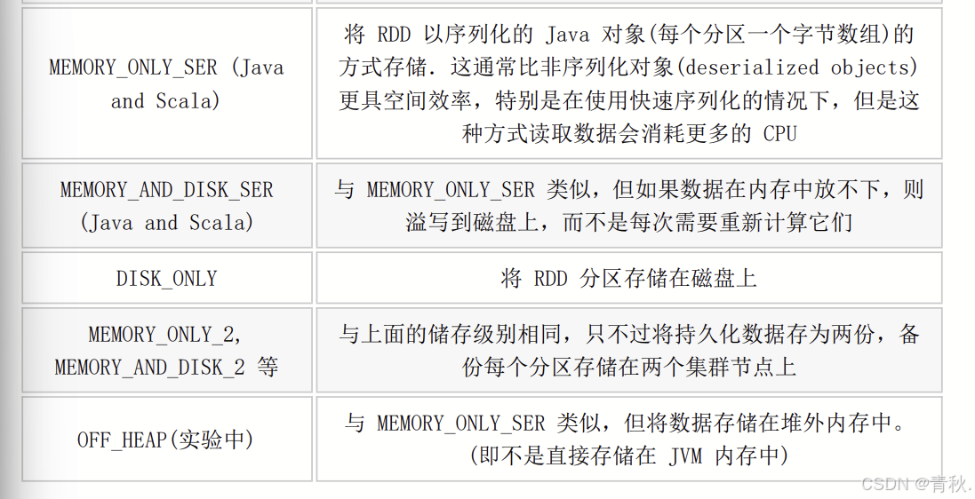 默认的存储级别都是仅在内存存储一份,Spark 的存储级别还有好多种,存储级别在 object StorageLevel 中定义的。