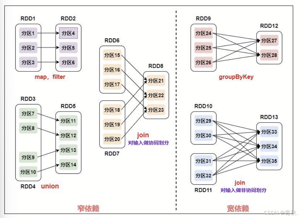 宽依赖(wide dependency/shuffle dependency) :父 RDD 的一个分区被子 RDD 的多个分区依赖(涉及到 shuffle)