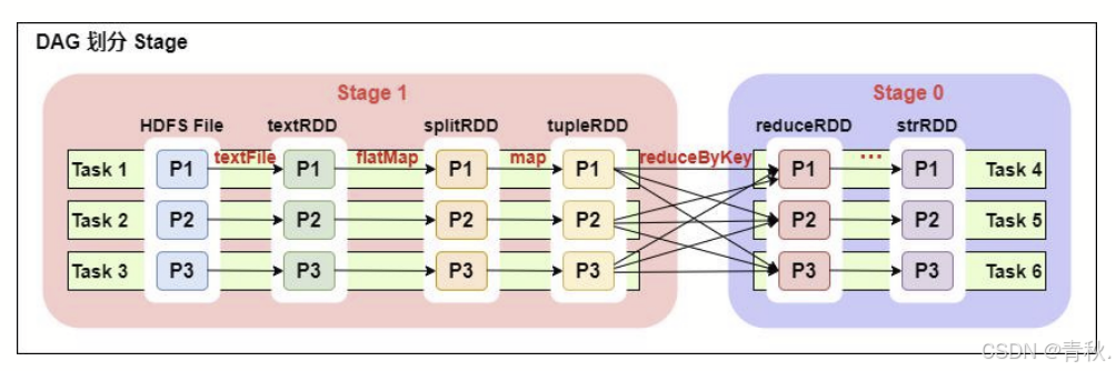 - 同一个 Stage 可以有多个 Task 并行执行(task 数=分区数,如上图,Stage1 中 有三个分区 P1、P2、P3,对应的也有三个 Task)。