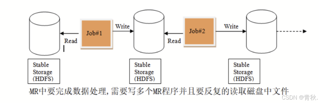 在许多迭代式算法(比如机器学习、图算法等)和交互式数据挖掘中,不同计算阶段之间会重用中间结果,即一个阶段的输出结果会作为下一个阶段的输入。但是, 之前的 MapReduce 框架采用非循环式的数据流模型,把中间结果写入到 HDFS 中,带来了大量的数据复制、磁盘 IO 和序列化开销,且这些框架只能支持一些 特定的计算模式(map/reduce),并没有提供一种通用的数据抽象。
