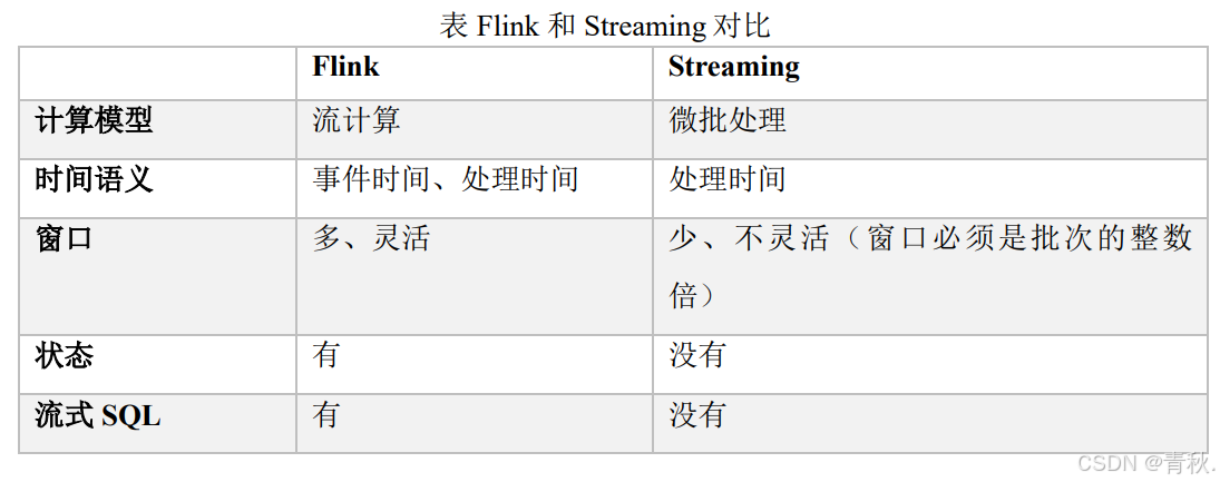 - Flink 是一个分布式、高性能、**有状态**的流处理框架,它能够对有界和无界的数据流进行高效的处理。Flink 的 **核心是流处理(DataStream),当然也支持批处理(DataSet),Flink 将批处理看成是流处理的一种特殊情况,即数据流是有 明确界限的。**这和 Spark Streaming 的思想是完全相反的,Spark Streaming 的核心是批处理,它将流处理看成是批处理的一种特殊情况, 即把数据流进行极小粒度的拆分,拆分为多个微批处理。