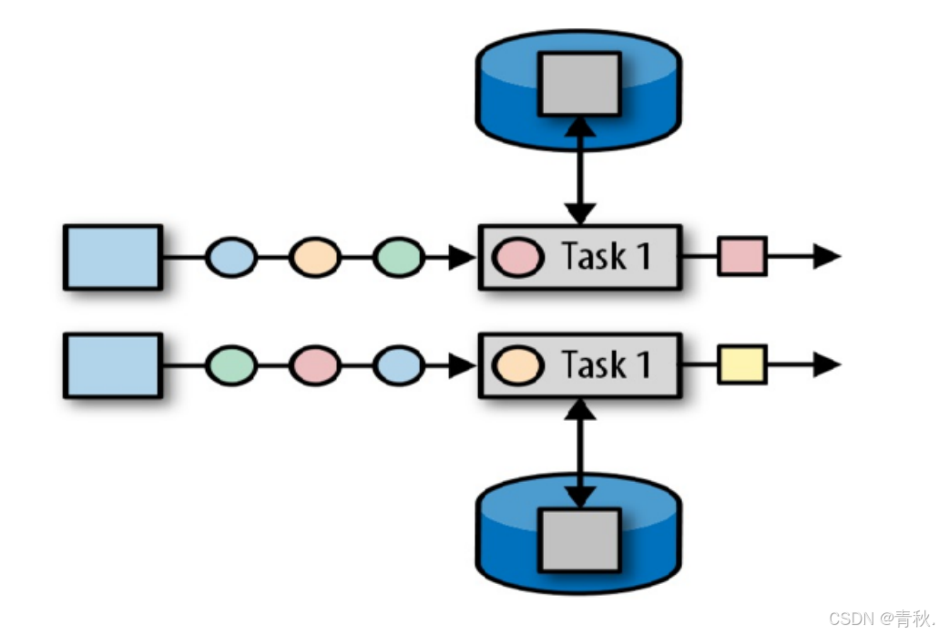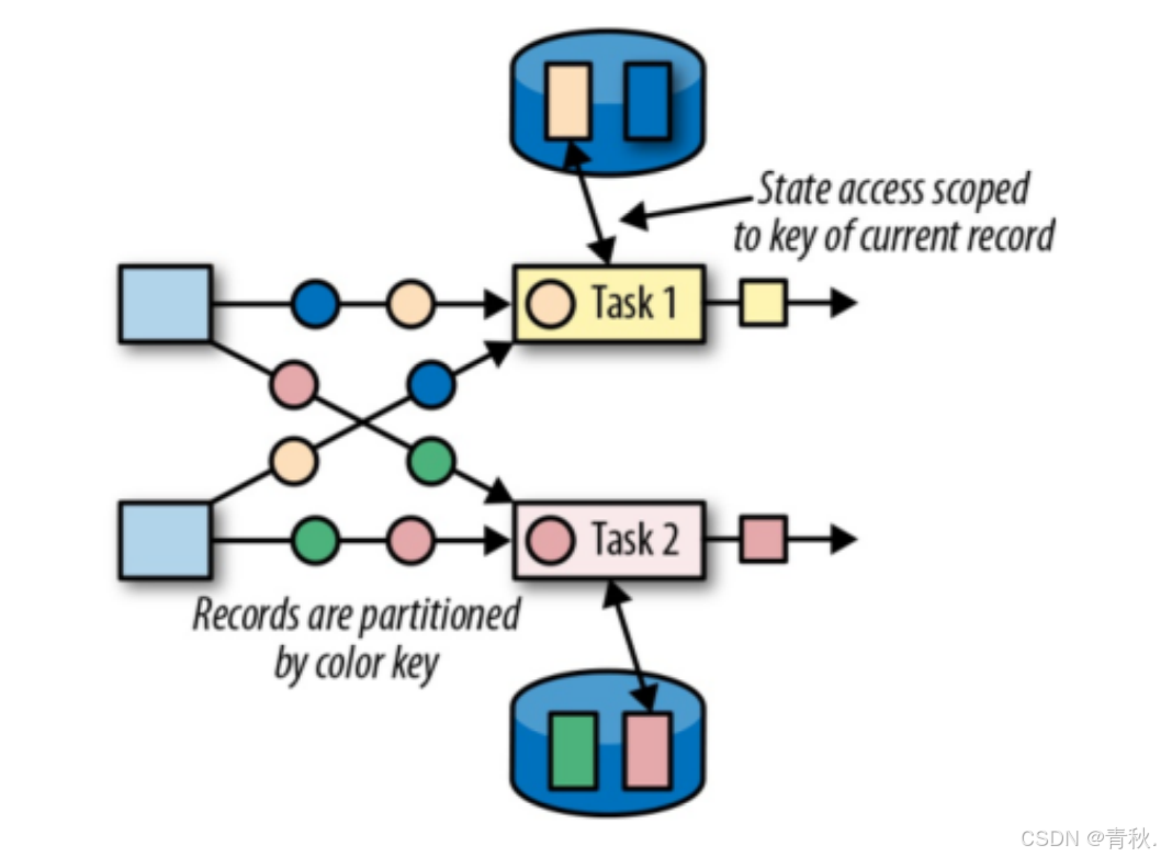 键控状态是一种特殊的算子状态,即状态是根据 key 值进行区分的,Flink 会为每类键值维护一个状态实例。如下图所示,每个颜色代表不同 key 值,对应四个不同的状态实例。需要注意的 是键控状态只能在 KeyedStream 上进行使用,我们可以通过 stream.keyBy(…) 来得到 KeyedStream 。