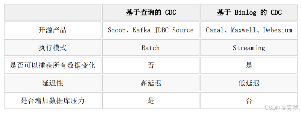 CDC 主要分为基于查询和基于 Binlog 两种方式,我们主要了解一下这两种之间的区别: